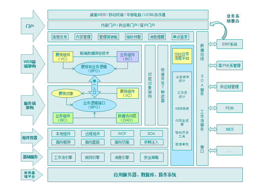 以I-BPS流程引擎\业务数据为基础,通过开放的Webservice接口、API接口、功能控件等企业自行开发的业务系统将流程引擎\表单等组件集成到各业务系统,实现业务系统的流程\数据驱动